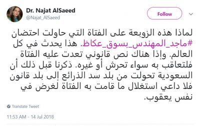 وكتبت السعيد في تغريدة لها على موقع “تويتر”: لماذا عاصفة فوق الفتاة التي حاولت معانقة ماجد المهندس في سوق عكاظ؟ إنه يحدث في جميع أنحاء العالم “.