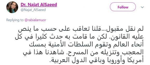 وقالت السعيد في ردها على أحد متابعيها: “لم نقول (ما حدث) مقبول .. قلنا عوقب وفق ما نص عليه القانون. لكن ما فعلته حدث كثيرًا في جميع أنحاء العالم وأخذت السلطات الأمنية المروحة وأبعدتها عن المسرح. لقد رأينا ذلك في أمريكا وأوروبا وبقية الدول العربية.