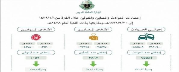 اظهرت الاحصاءات انه في تسعة اشهر من هذا العام بلغ عدد الحوادث 285.508 مقارنة بـ 361.090 في نفس الفترة من العام السابق بانخفاض قدره 20.93٪ وهو انخفاض بنسبة 18.6٪ وعدد الاصابات في هذه الحوادث انخفض من 25787 إلى 22925 ، وهو ما يمثل انخفاضًا بنسبة 11.1٪.