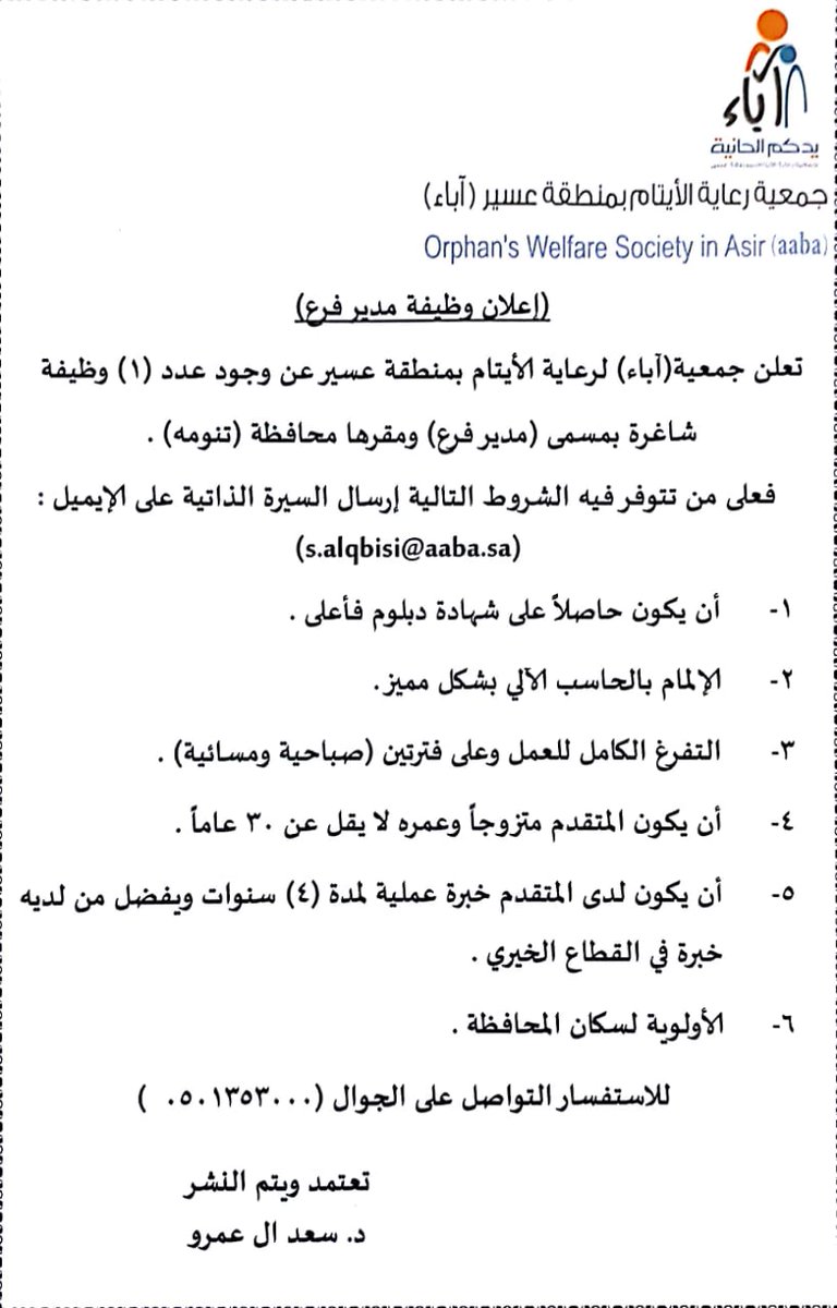 أعلن فرع محافظة تنومة لجمعية رعاية الأيتام “أباء” عن توفر منصب مدير فرع موضحًا أن الأفضلية هي لسكان المحافظة.