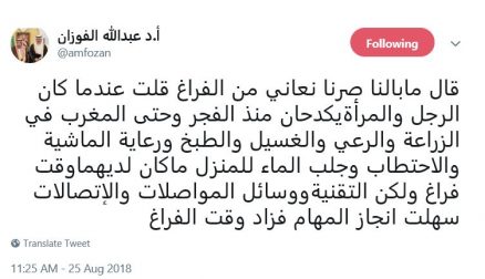 وذكر الفوزان في تغريدة على حسابه على موقع “تويتر” وقت عمل الرجال والنساء في العمل منذ الفجر ، سواء كان ذلك في الزراعة والرعي وقطع الأشجار.